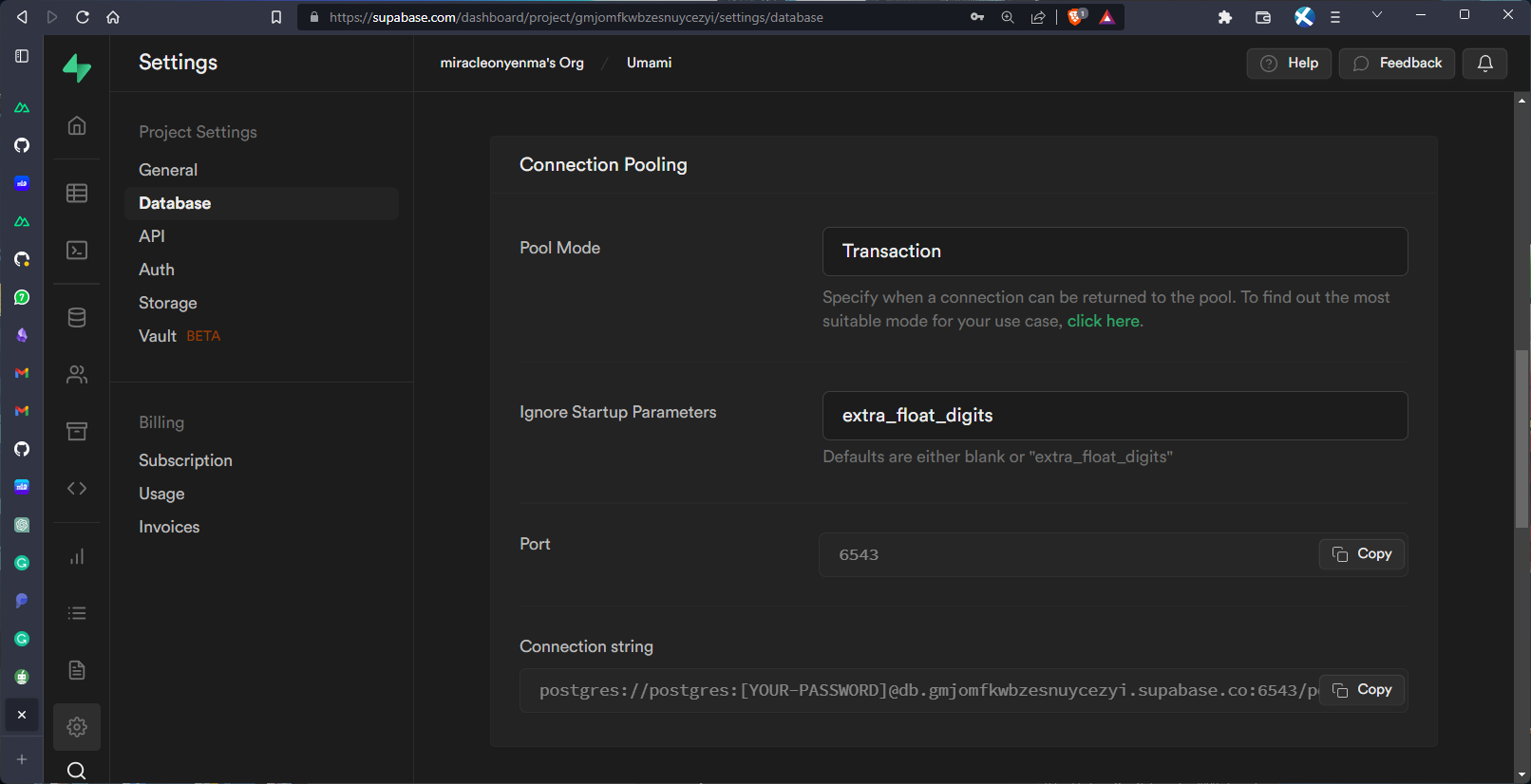 Once created, obtain the database connection string from Database page in Settings. Scroll down to Connection String > URI or Connection Pooling and copy the value.