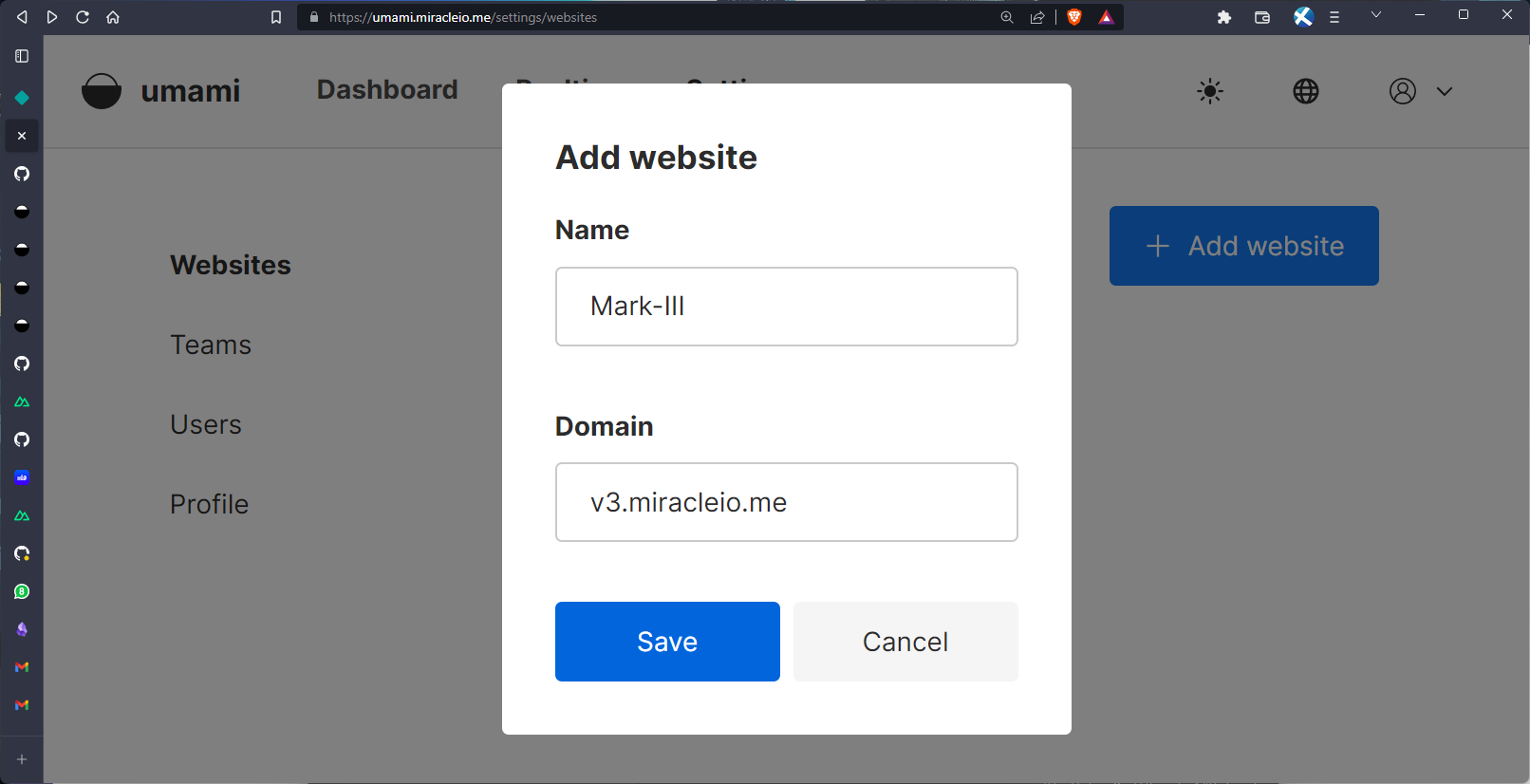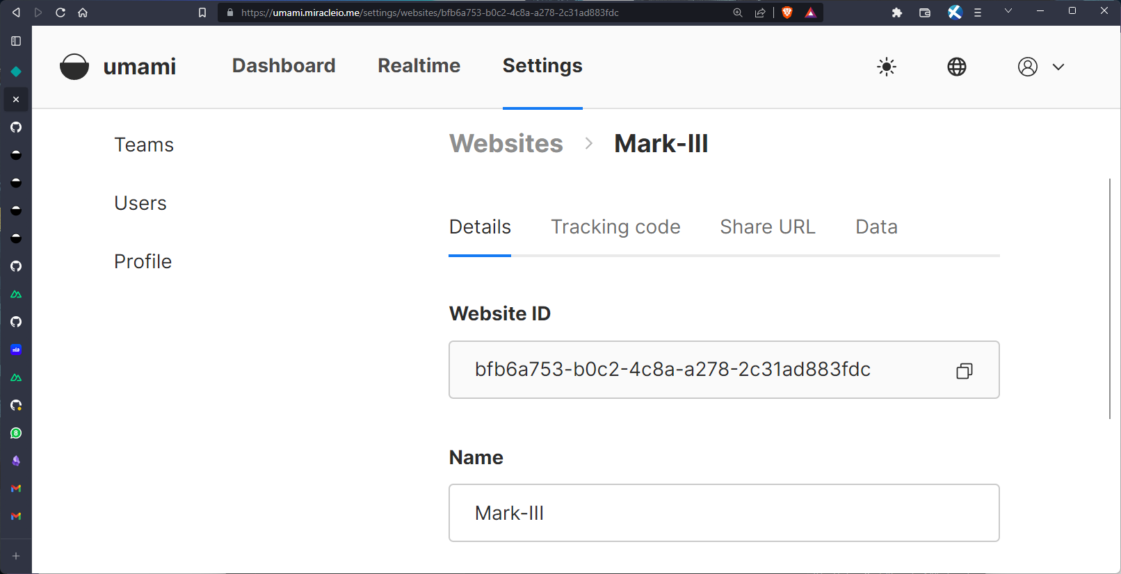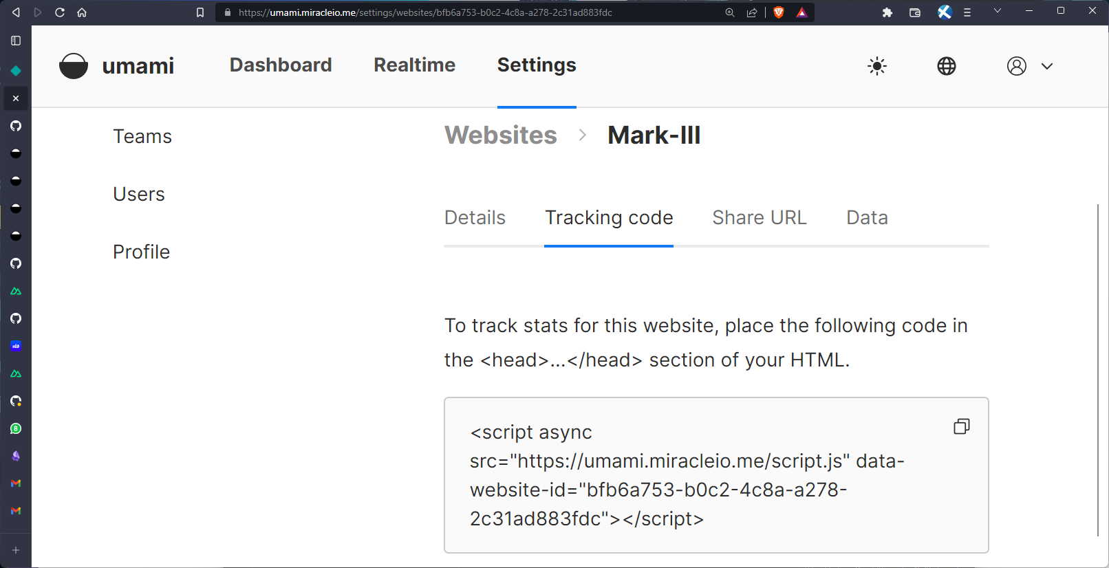 Here, I'm adding my currently deployed Nuxt application at https://v3.miracleio.me and giving it the name Mark-III. Once that's done, Umami provides us with a tracking ID we can add to our site.